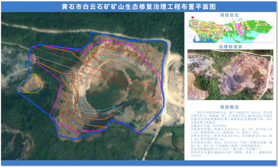 白云石礦礦山生態(tài)修復(fù)治理項(xiàng)目計(jì)劃投資900萬(wàn)元,工程造價(jià)767.29萬(wàn)元,工期:90日歷天,其主要工程為:坡面削(清)方+漿砌石擋土墻+排水溝+馬道封邊墻+高次團(tuán)粒噴播綠化+覆土植樹(shù)綠化+監(jiān)測(cè)預(yù)警工程。其中漿砌石擋墻總長(zhǎng)661m,設(shè)計(jì)排水溝總長(zhǎng)639m,設(shè)計(jì)3級(jí)馬道,總長(zhǎng)825m,掛網(wǎng)噴播面積22872.86m2(爬山虎常春藤),綠化喬木灌木栽植4652株(刺槐、香樟),播撒草籽16726m2。