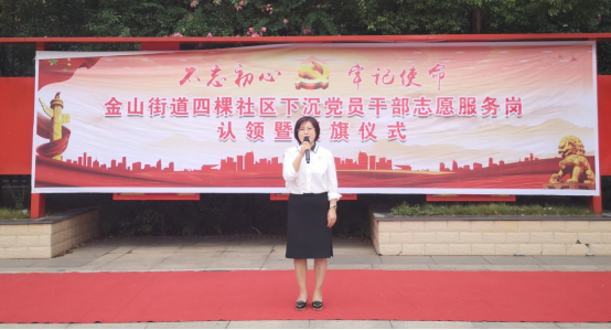 黃石高新物業(yè)公司董事長鄒丹在社區(qū)下沉黨員干部志愿服務(wù)崗認(rèn)領(lǐng)暨授旗儀式上做動(dòng)員講話