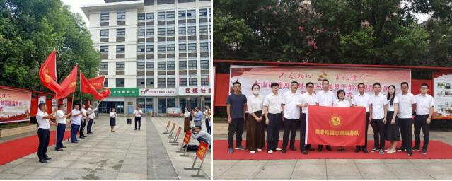 黃石高新物業(yè)公司董事長鄒丹為社區(qū)科普宣教、助老助困等5支志愿服務(wù)隊(duì)授旗并合影留念