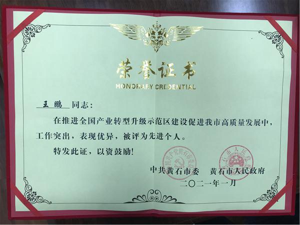 2月19日,在全市“思想破冰 引領(lǐng)發(fā)展”主題活動暨深入優(yōu)化營商環(huán)境動員大會上,中共黃石市委、黃石市人民政府發(fā)布了《關(guān)于表彰黃石市治理能力建設(shè)突出貢獻和促進轉(zhuǎn)型升級推進高質(zhì)量發(fā)展先進集體和先進個人的決定》。黃石經(jīng)開投項目建設(shè)管理有限公司總經(jīng)理王鵬同志榮獲“黃石市促進轉(zhuǎn)型升級推進高質(zhì)量發(fā)展先進個人”稱號。