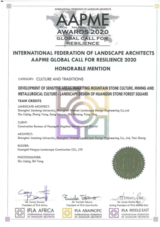 2020年,獲國(guó)際風(fēng)景園林師聯(lián)合會(huì)亞非中東地區(qū)榮譽(yù)獎(jiǎng)。